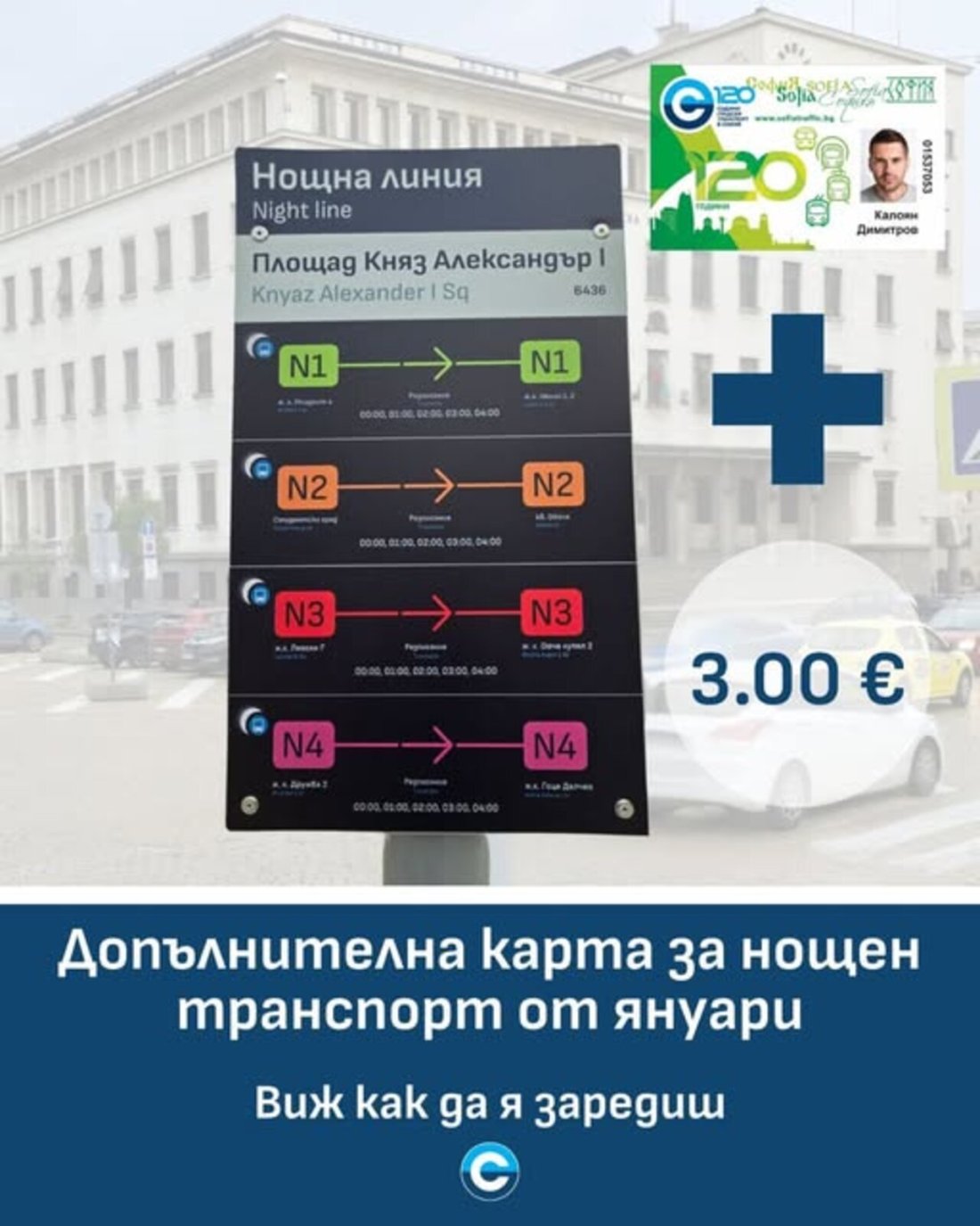 Нощният превоз в София става по-достъпен от 1 януари 2026 година, оповестяват от Центъра за градска подвижност. Пътниците с дълготрайни абонаменти за публичния превоз към този момент ще могат да прибавят към тях спомагателна карта за всички нощни линии - N1, N2, N3 и N4.