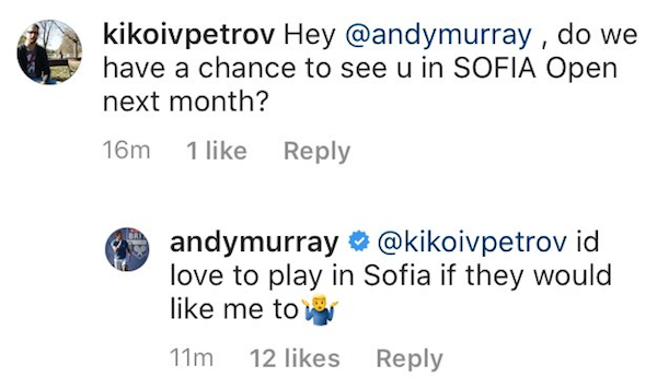 Носителят на 3 трофеи от “Големия шлем” и повторен олимпийски първенец Анди Мъри изяви предпочитание да взе участие на Sofia Open през ноември, в случай че получи “уайлд кард” от уредниците на шампионата в зала “Арена Армеец”. Това стана ясно, откакто 33-годишният шотландец бе запитан от български тенис почитател в Twitter дали има късмет да забележим някогашния №1 в света в София идващия месец.