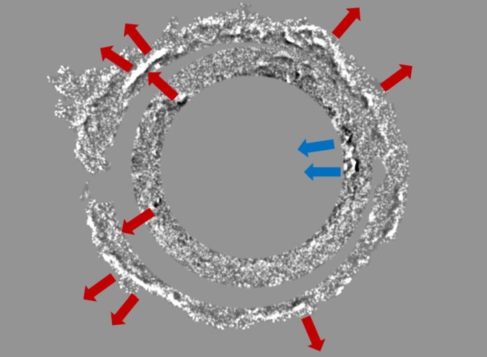 Специалистите откриват, че част от западната част на вътрешния район на обвивката се придвижва във вътрешността – към центъра – със скорост от 3000 до 8000 км/с. Те също по този начин откриват, че външната ударна вълна в същия район на обвивката се форсира. Според компютърни модели, пресъздаващи разширяваща се ударна вълна, конфликт с някакъв обект ще накара в началото ударния фронт да понижи скоростта си, а след това – да се форсира. „ Точно както измерихме и ние “, изяснява Винк.