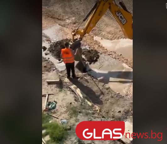 На място има служащ и екскаватор. За момента не е ясно дали тръбата се е спукала или машина я е увредила, като се съди по историята по-скоро е второто.