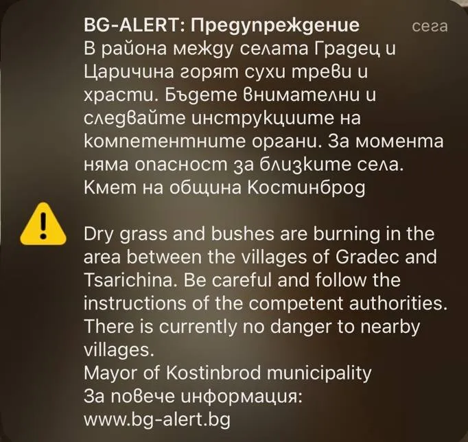 Нов пожар избухна край Костинброд. По искане на кмета на Костинброд Трайчо Младенов е задействана системата BG-Alert, оповестиха от пожарната работа.