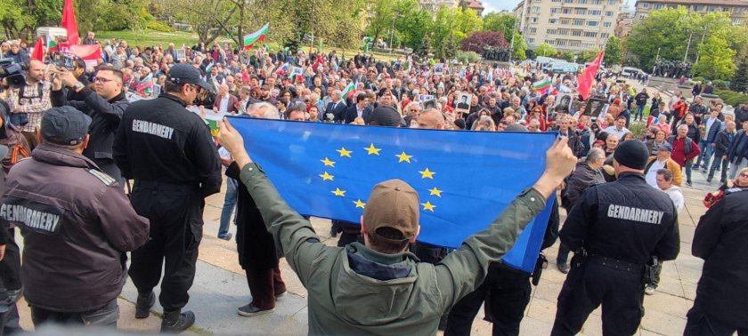 Пред паметника на Съветската войска, с изключение на участниците в шествието, са се събрали и хора, които се опълчват на експанзията на Русия в Украйна и на цялостната политика на Кремъл. Те упорстват за събарянето на паметника на руската войска.