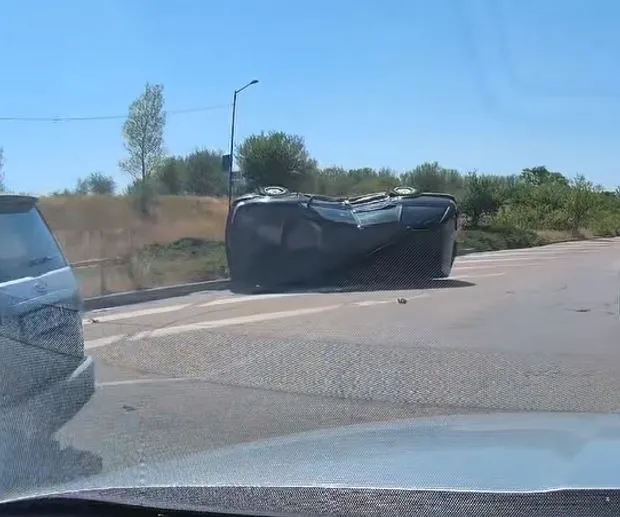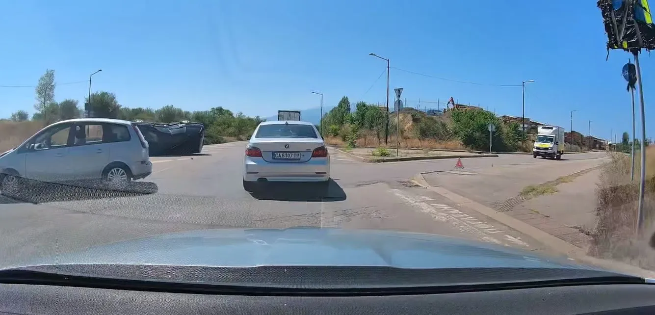 Бус се е обърнал странично на пътното платно след удар в София. Прозишествието е станало на ул. " Източна дъга ", под " Ботевградско шосе ". Другата кола е спряна странично на пътното платно.