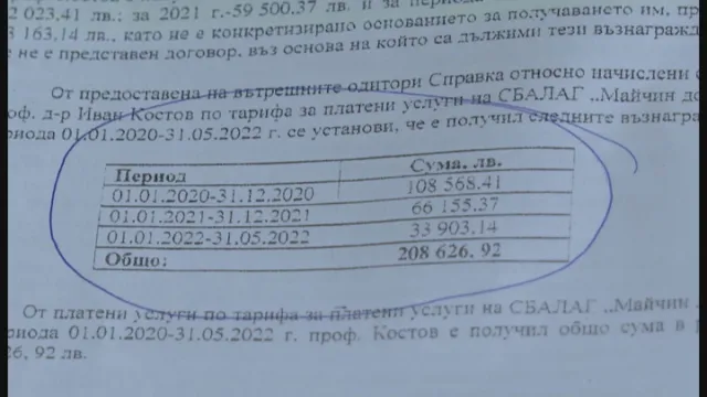 В сигнал до bTV лекари от болница Майчин домобявиха, че разполагат с одитен отчет, от който излиза наяве, че изпълнителният шеф Иван Костов е получил над 1 707 000 за две години и половина. bTV също разполага с документа.