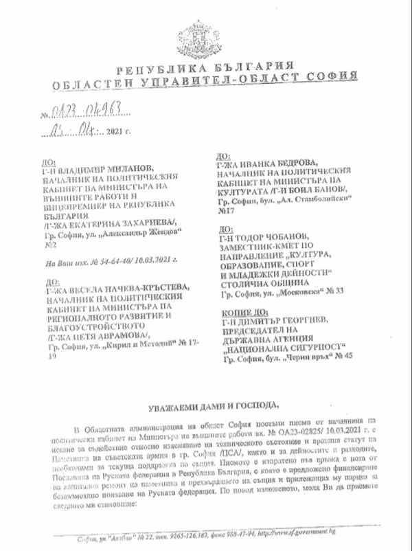Освен това братушките показват подготвеност да поемат ремонта и стопанисването на мемориала на окупатора. Това излиза наяве от публична преписка от началото на април месец сред регионалния шеф на София град Николай Пехливанов до разнообразни институции в страната, имащи отношение към тематиката.
