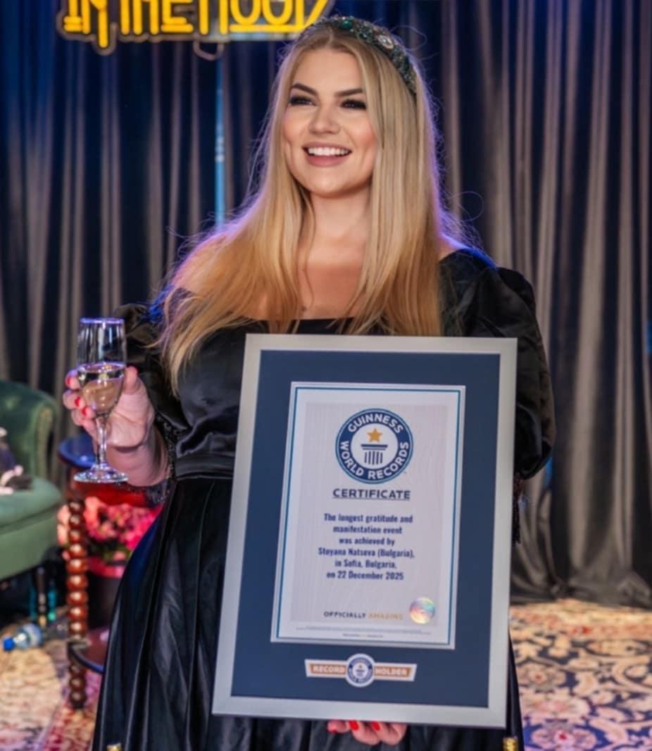 Нов международен връх на Guinness World Records популяризира България, откакто Проф. Доктор Стояна Нацева сполучливо осъществя 25-часовото непрестанно трансформационно шоу „ Longest Gratitude and Manifestation Event “ – „ Най-дългото събитие за манифестиране посредством признателност “.
