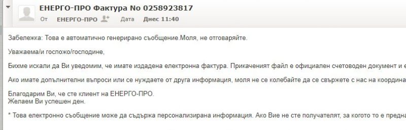 "Бихме желали да Ви уведомим, че имате издадена електронна фактура. Прикаченият файл е формален счетоводен документ и е в сходство с условията на Закона за електронния документ и електронния автограф ", написа в мейла.