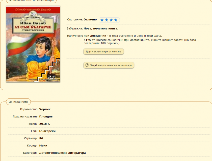 И за тези, които ще кажат, че е фейк-новина - книжката я има в каталога на издателството, цена 4 лв.. А анотацията за изданието на " Хермес " е още по-цинична, по отношение на дядо Вазов: " В сборника са включени едни от най-популярните и родолюбиви стихове на класика на българската литература Иван Вазов ".
