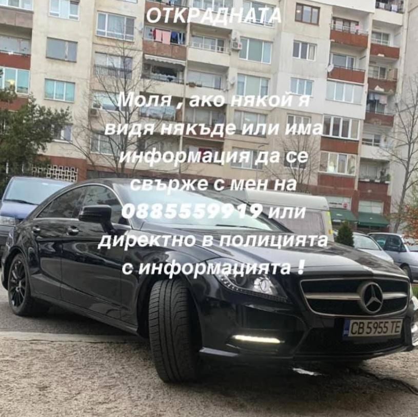 " През измината нощ - 07.05.22 против 08.05.22, в региона на " Младост 3 " в гр. София е откраднат автомобила ми - марка " Мерцедес ", модел CLS 550, с регистрационен номер - СВ5955ТЕ. Моля, в случай че някой го види някъде или има някъква информация да се свърже с мен на 0885559919 или да подаде сигнал непосредствено в полицията. "