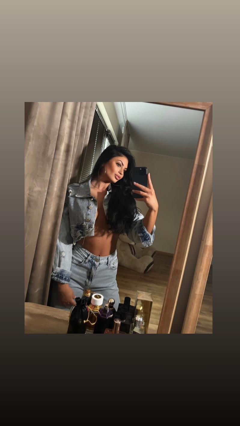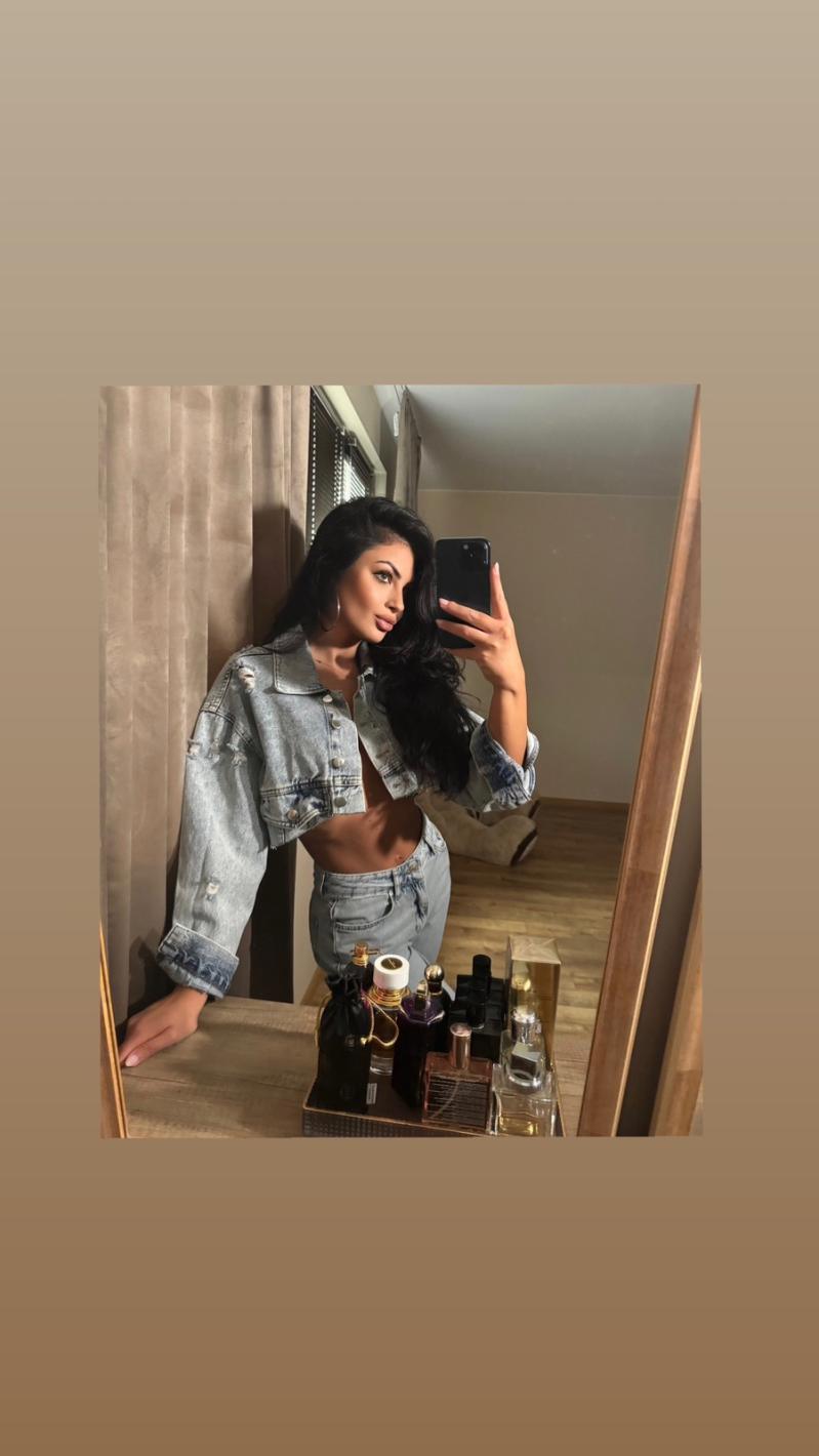 Моделката метна единствено едно късо дънково якенце върху силиконовите си гърди, без да си облече блуза или даже сутиен под него, видя Mister. bg.