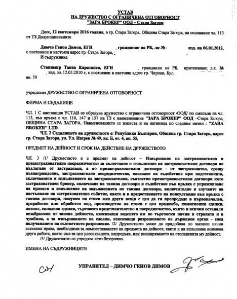 Дружеството " Зара Брокер " е основано през 2016 година. Управители в него с по 1 лев капитал са Димчо Димов от Стара Загора и Станимир Каратанев от Чирпан. А в новата мода да се пречи на държавни и общински възложители компанията се включи през февруари месец т. година Потърпевши от нея са още обекти на общините Луковит, Елена, Якимово, Петрич (с две поръчки), Омуртаг, Столична община (с поръчка за 16,6 млн. лева.), Ловеч, Любимец, Твърдица, Черноочене, Велинград, Симеоновград, Вършец, Пловдив. Отделно са блокираните обекти на АПИ, Държавен куклен спектакъл – Пловдив, и регионалния шеф на Смолян.