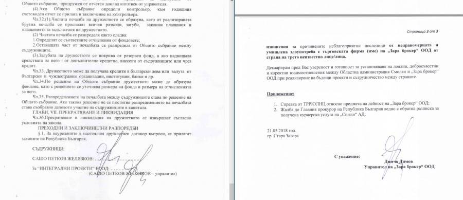 Много по-внимателен обзор на документите обаче сочи, че има основателно подозрение, че изпратеното до регионалния шеф на Смолян писмо не е подписано от Димчо Димов. Подписите в писмата до възложителите и този, който е подписал учредителните актове на " Зара Брокер " ООД и всичките други 11 компании на Димчо Димов, не наподобяват идентични.