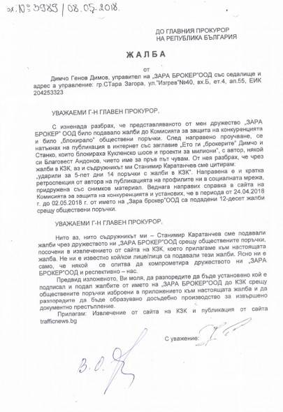 За това събитие Димов е сезирал прокуратурата посредством тъжба до Главния прокурор Сотир Цацаров на 08.05.2018 год. От Цацаров той желае да разпореди инспекция за това кой е подписал и подал жалбите от името на " Зара Брокер " ООД до Комисия за защита на конкуренцията против публичните поръчки от името на " Зара Брокер " ООД. Димов оповестява, че към сегашния миг е формирана прокурорска кореспонденция по случая, която е разпределена по подготвеност на Софийска градска прокуратура.