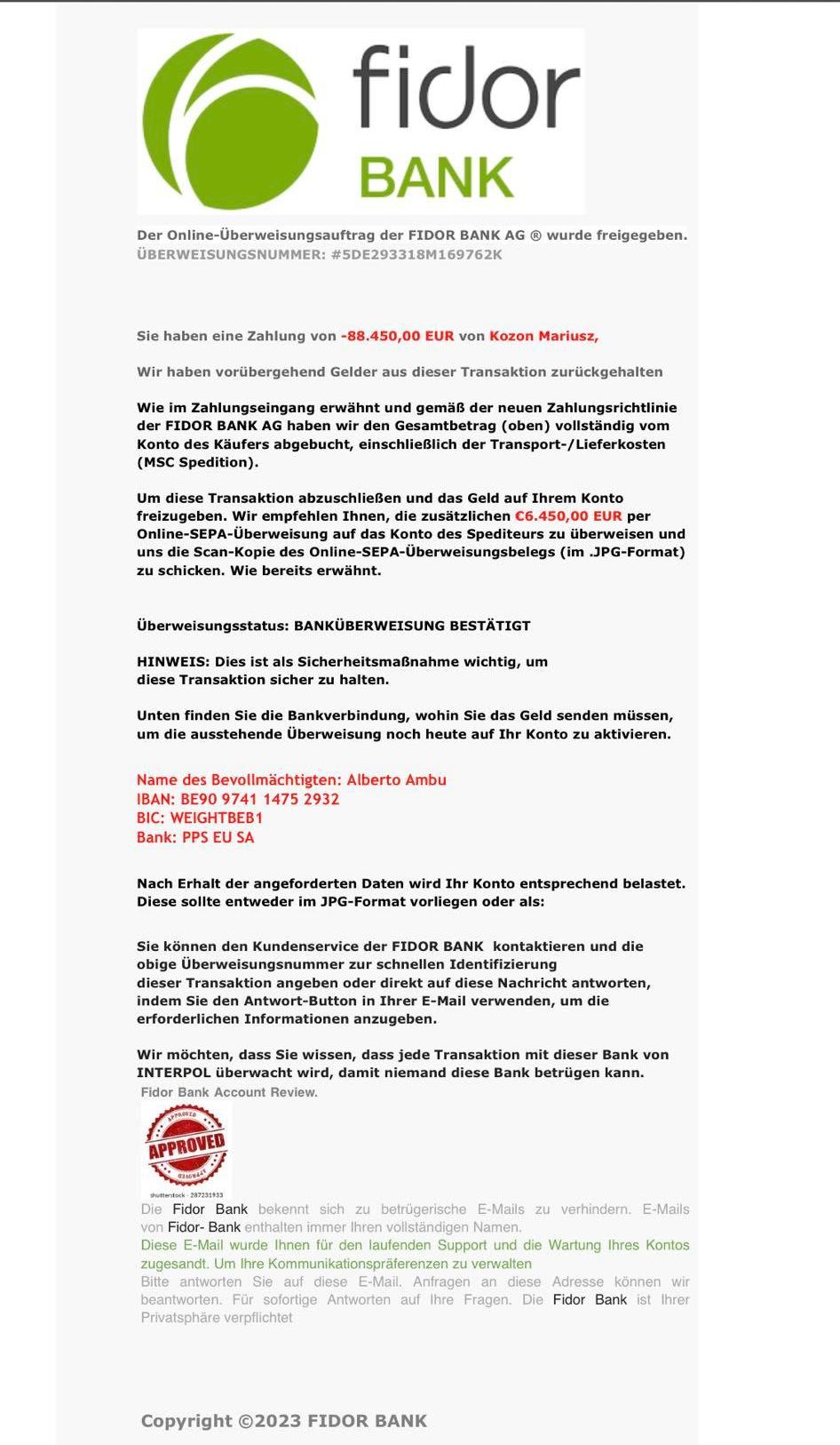 Междувременно обаче мъжът получава имейл с банков документ, че парите за колата са преведени, само че заради политика за сигурност на банката сумата е арестувана. Финансовата институция, за която се твърди, че е издала документа, е немската FIDOR BANK AG. За да бъде освободена транзакцията, би трябвало да се извърши допълнителен превод от €6450,00 EUR по сметката посредством онлайн SEPA превод.