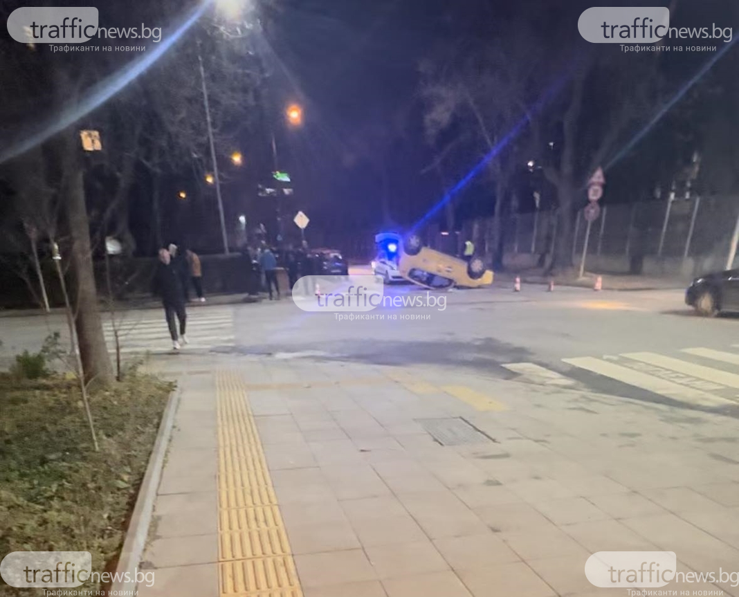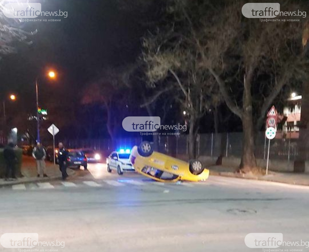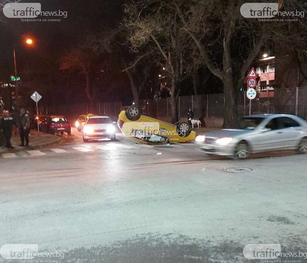 Нова тежка злополука се случи довечера в Пловдив. Такси се обърна по таван на кръстовището на ул. " Лев Толстой " и ул. " Богомил ".