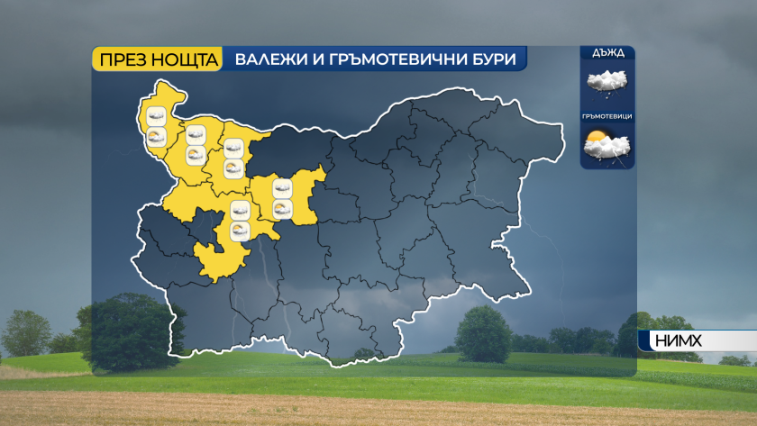По Черноморието валежи и гръмотевици ще има основно по северното крайбрежие. Ще духа до сдържан северозападен вятър. Максималните температури ще са сред 26° и 29°. Температурата на морската вода е 25°-26°, а вълнението на морето ще е 2-3 бала.