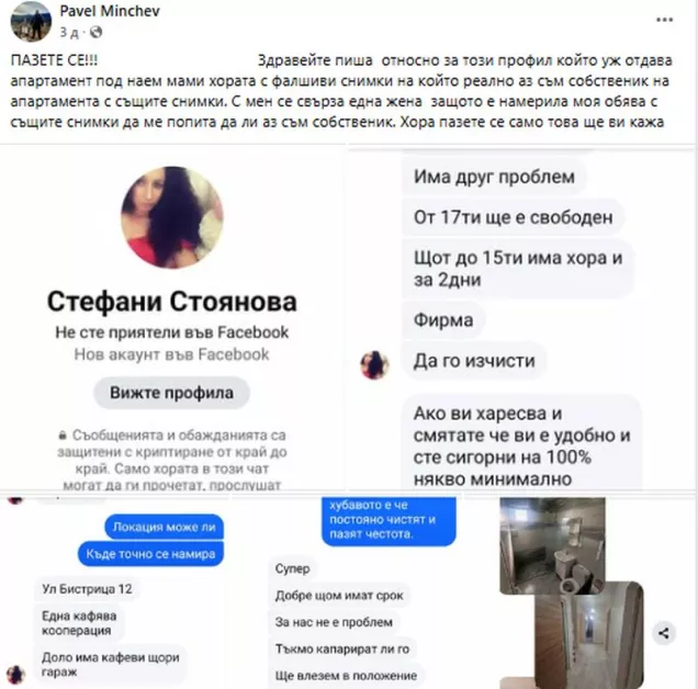 Измамата е още веднъж дейна – подправени фотоси, ниска цена за наем и искане на капаро, което „ резервира “ жилището. След превод – контактът се прекъсва, профилът изчезва, а парите не се връщат. Пловдивчанинът Павел Минчев е последният, който се сблъсква с незаконната скица. Той подава сигнал в групата „ Квартири чартърен БЕЗ Посредник – Пловдив “, откакто открива, че негови персонални фотоси на жилище се популяризират от чужд профил.