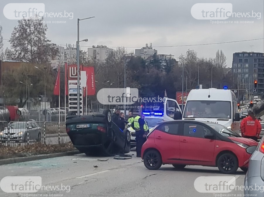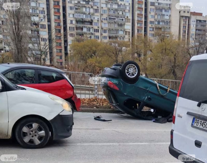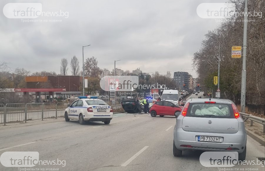 Зрелищна катастрофа в Пловдив: Кола е обърната по таван на моста на Ален Мак