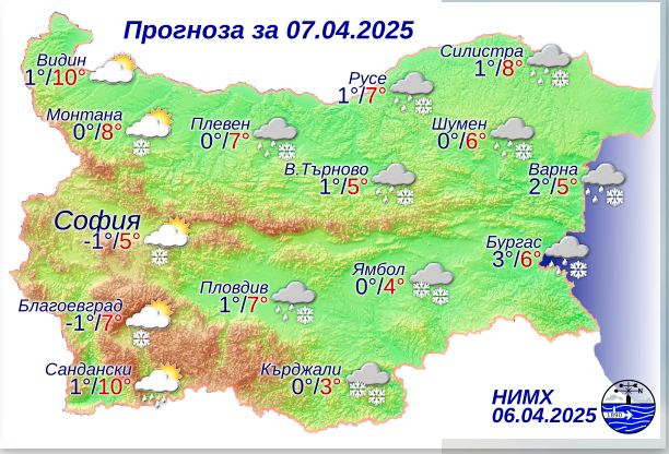 По Черноморието съвсем през целия ден ще бъде облачно с превалявания от дъжд и сняг. Спиране на преваляванията и скъсване и понижение на облачността ще настъпи вечерта. Ще духа сдържан до мощен северен вятър. Максималните температури ще бъдат 5°-6°. Температурата на морската вода е 9°-10°. Вълнението на морето ще се усили до 3-4 бала, а на юг от Бургас до 5 бала.