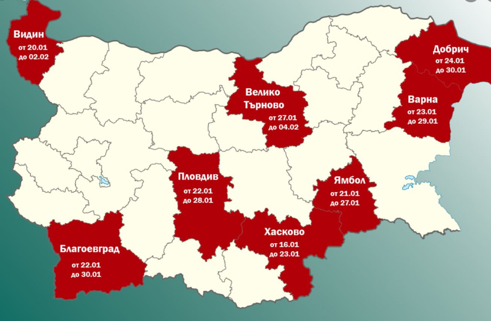 Нови две области на страната афишират грипна зараза. От на следващия ден – 24 януари, краткотрайни противоепидемични ограничения се вкарват в Добрич. Те ще важат до 30 януари. В област Велико Търново ограниченията влизат в действие от понеделник – 27 януари до 4 февруари. Там ще бъде въведено и наложително носене на здравна маска за лице от медицинския и немедицинския личен състав в лечебни заведения, както и от пациентите. Това оповестяват от Министерството на здравеопазването. Междувременно срокът на оповестената във Видин зараза се удължава до 2 февруари, като се преустановяват присъственият образователен развой и провеждането на извънкласни занимания и проведени действия с възпитаници на територията на община Видин. Припомняме, че в действие са краткотрайните ограничения в още пет области – Варна, Хасково, Ямбол, Пловдив и Благоевград. Във всички със заповеди на шефовете на съответните РЗИ са прекратени профилактичните прегледи, наложителните имунизации и реимунизации и плановите съвещания на здрави бременни дами и деца, а също по този начин свижданията в лечебните заведения за болнична помощ и в профилираните институции за даване на обществени услуги и обществени услуги от резидентен вид за деца и възрастни.