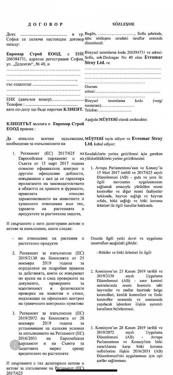 Факсмиле от първата страница на проектодоговора с “Евромар Строй” ЕООД, предлаган на превозвачите на границата