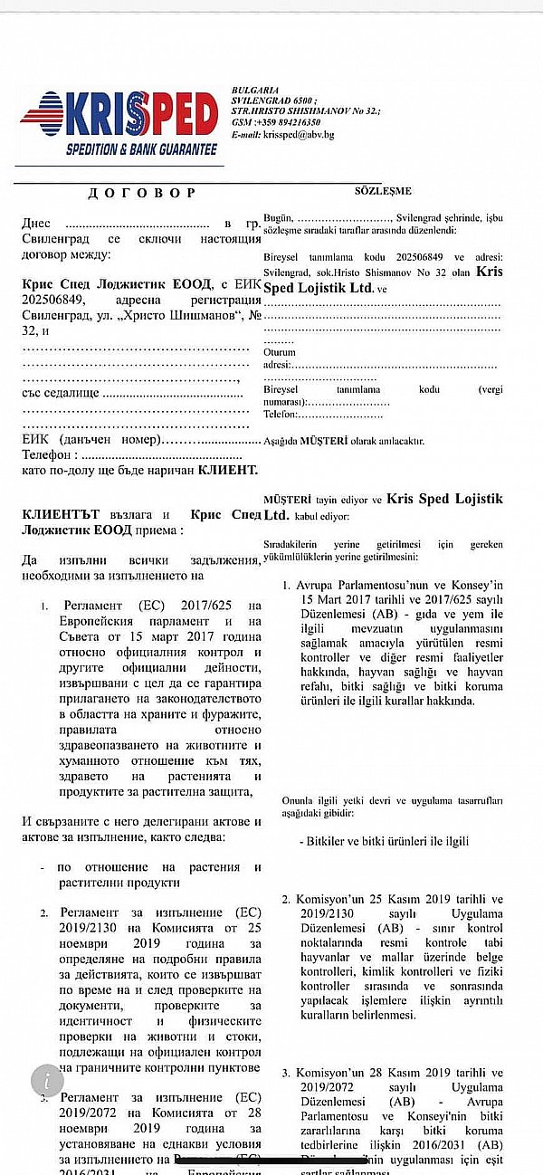 Факсимиле от първата страница на контракт с записаното за 2 лв. в Хасково сдружение “Крис Спед Лоджистик” ЕООД, който е предоставян на превовачите на границата