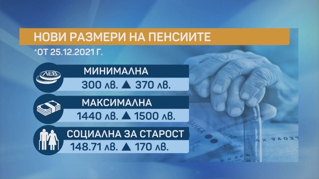Минималната за стаж и възраст се усилва от 300 на 370 лева, а оптималната – от 1440 на 1500 лева Социалната пенсия за напреднала възраст към този момент е 170 лева