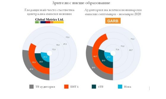 Постигнатите пийпълметрични резултати от всички новинарски излъчвания в ефира на водещите ТВ канали за първите три месеца от телевизионния сезон (септември – ноември 2020), измерени от " ГАРБ Аудиенс Межърмент България " (ГАРБ), удостоверяват разпределението на феновете по обучение в демографския профил на аудиторията на новинарско наличие. Делът на високо образованите фенове от аудиторията на " По света и у нас " е 44,3%, против 29,5% и 27,6% от аудиторията на новинарските излъчвания на директните съперници . За съпоставяне, делът на хората с висше обучение е едвам 27% от популацията в страната (НСИ), а от телевизионната публика като цяло в слота на новинарските излъчвания на Българска национална телевизия – 29,8% (ГАРБ).