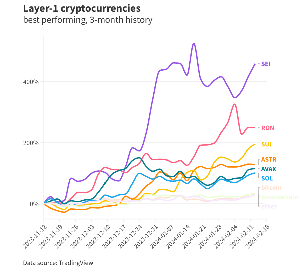 Новите блокчейн мрежи като Sui, Sei и Ronin сега означават забележителен напредък. Техните родни криптовалути са нараснали цената си три пъти през последното тримесечие.