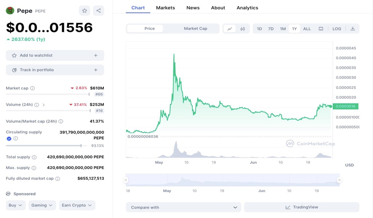 Някои участници на крипто пазара влагат чисто и просто за развлечение, само че някои токени като $PEPE съумяха да скочат с над 26 ПЪТИ и даже да се намърдат измежду най-хубавите алткойни. Въпреки че цената падна почти 4 пъти след най-големия скок (тоест, разбирайте 100 пъти скок в началото), PEPE още веднъж се увеличи, с което затвърди позициите си, а не се трансформира в “pump-and-dump ” скица (които прочее не са толкоз рядко срещано събитие в крипто средите).