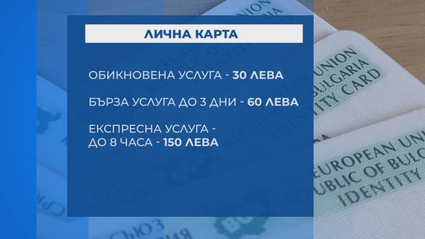 Бързата услуга за издаване за период от 3 дни ще коства 60 лв., а експресната услуга - в границите на 8 часа - ще коства 150 лв.. Експресно издадените документи обаче ще могат да се получават единствено от София, само че ще могат да се декларират във всяко едно районно ръководство на територията на страната. Запазва се безплатното издаване на първа персонална карта на навършилите 14 години, както и за хората, навършили 70 години.
