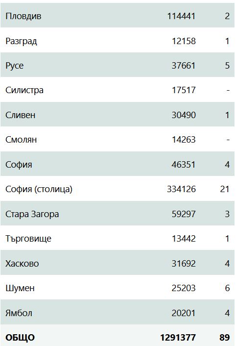 Новите доказани случаи на COVID-19 у нас за последното денонощие са 89, сочат данните на Единния информативен портал. Направени са 1 208 теста което значи, че делът на позитивните резултати е 7,3 %.