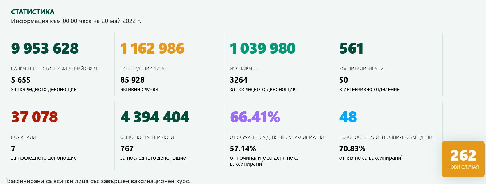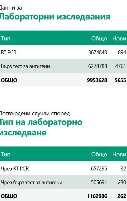 Новите случаи на COVID-19 са 262 при направени 5655 теста. Така към 4,6 % са позитивните проби. Това демонстрират данните, оповестени от Единния информативен портал.