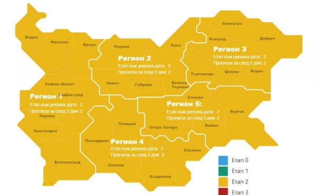 Единният информативен портал към този момент показва данни за заетостта на интензивните кревати в петте клъстъра. Към днешна дата и петте района към този момент са на Етап 2 или в жълтата зона, което значи, че страната ни е по-близо до унищожаване на рестриктивните мерки.
