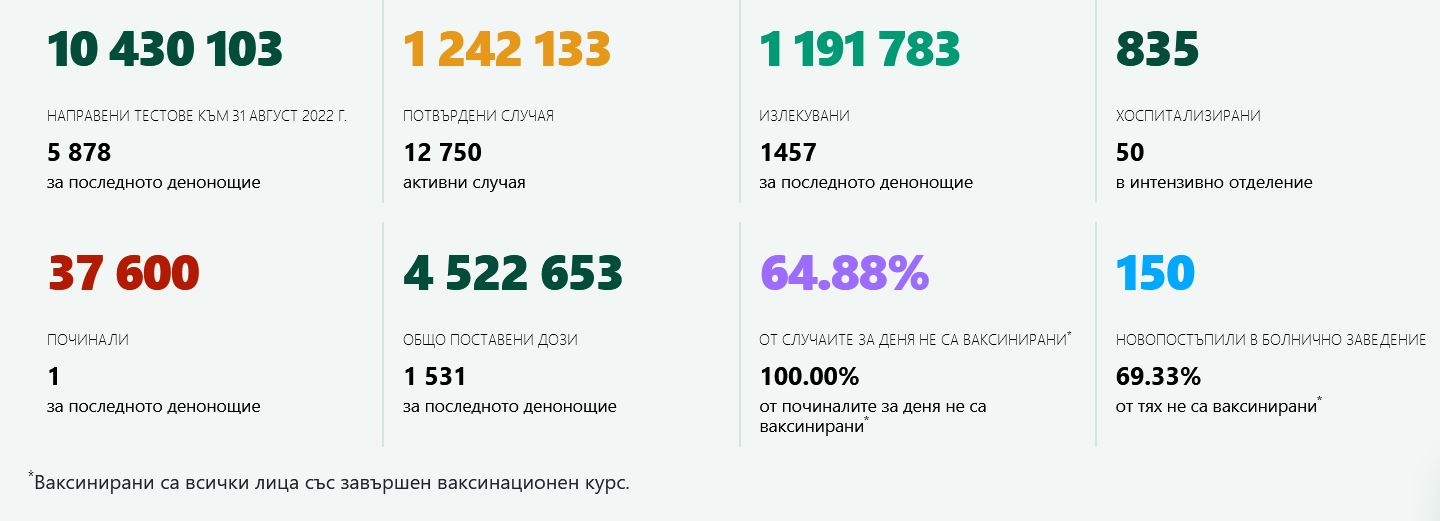 Направени са малко над 5800 теста, което значи, че позитивните резултати са близо 15%. Починал е 1 пациент с доказана коронавирусна зараза. Още 150 души са в болница, по този начин общият им брой сега е 835.