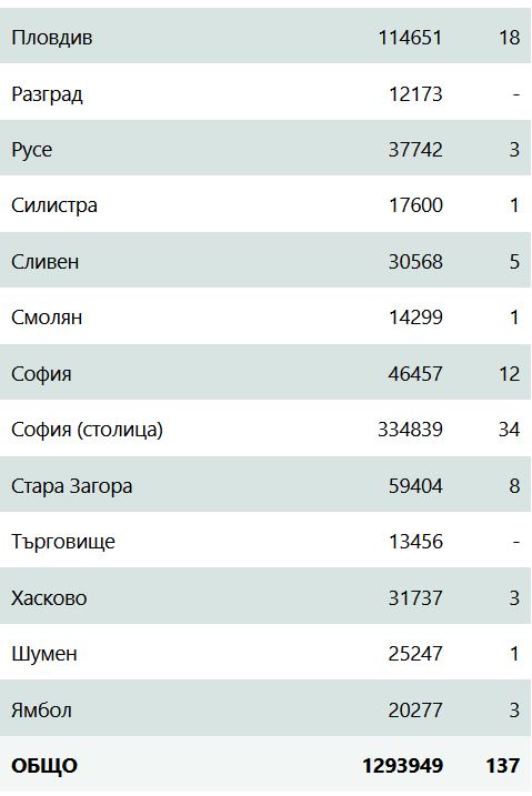 Новите случаи на ковид у нас за последното денонощие са 137, сочат данните на Единния информативен портал. Направени са 3171 теста, което значи, че делът на позитивните резултати е 4,1 %. Починал е са един пациент с доказана коронавирусна зараза.
