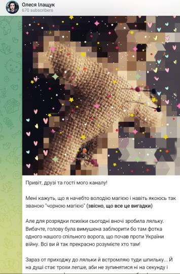 „ Здравейте, другари и посетители на моя канал! Казаха ми, че наподобява владея вълшебен сили и даже притежавам по този начин наречената " черна магия " (разбира се, всичко това е измислица), само че с цел да се успокоя, довечера направих кукла. Съжалявам, трябваше да скрия главата й, тъй като има фотография на един от нашите общи врагове, който стартира война против Украйна. Всички вие прелестно разбирате кой е там! Сега стигам до куклата и забивам топлийка в нея... И ми става малко по-леко на душата, няма да спирам нито за секунда да си правя работата допустимо най-ефективно! Нека моите другари и познати да се посмеят, а враговете ми да се изплашат “, пише Илашчук и прибавя фотография, с цел да покаже куклата.