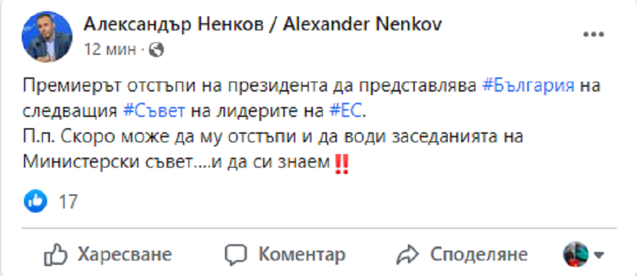 П.п. Скоро може да му отстъпи и да води съвещанията на Министерски съвет… и да си знаем “, написа в собствен коментар във Facebook депутатът от ГЕРБ Александър Ненков.