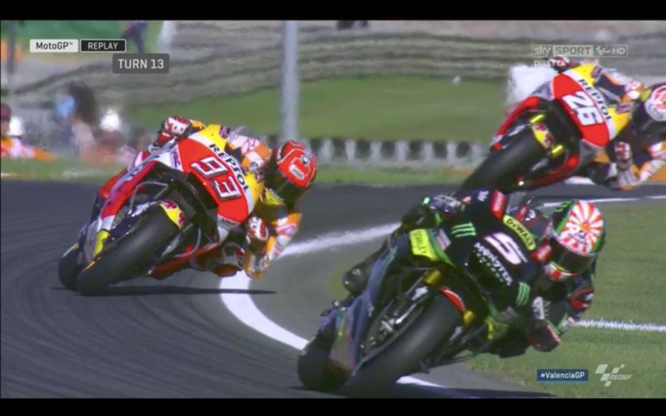 За огромна част от спортната отдалеченост Маркес се движеше зад Зарко, само че секунди преди да допусне неточност съумя да го изпревари.