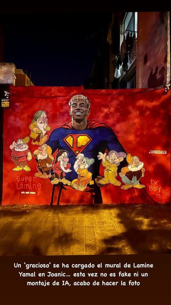„ Някой „ майтапчия “ е унищожил стенописа на Ламин Ямал на площад „ Жоаник “... Този път не е подправена вест, нито монтаж с изкуствен интелект. Току-що направих фотографията “, изяснява Еду Поло, публикувайки изображението на осквернения стенна живопис.