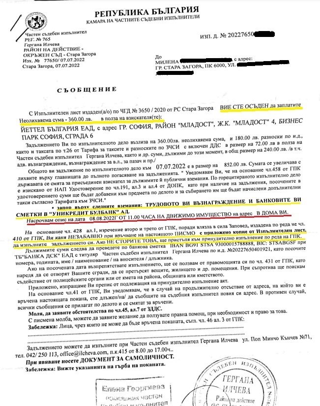 На 7 юли 2022-а ЧСИ Гергана Илчева от Старозагорския областен съд подхванал дейности против Милена М. поради несъществуващо обвързване от 360 лв..