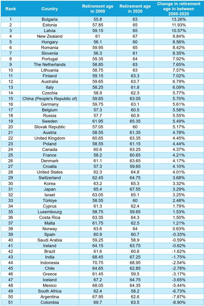 Проучването проучва данните на Организацията за икономическо сътрудничество и раз по отношение на възрастта за пенсиониране във всички налични страни от 2000 година до 2020 година, с цел да открие в кои страни има най-голямо нарастване.