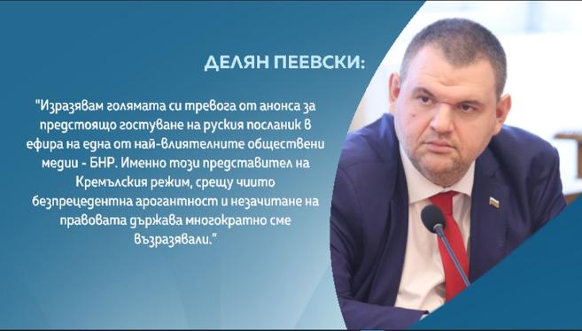 Около час по-късно с сходна позиция излезе и глобеният по закона „ Магнитски ” народен представител и ръководител на ПГ на Движение за права и свободи Делян Пеевски. „ Изразявам огромната си паника от анонса за идно посещение на съветския дипломат в ефира на една от най-влиятелните публични медии – БНР ”, декларира той.