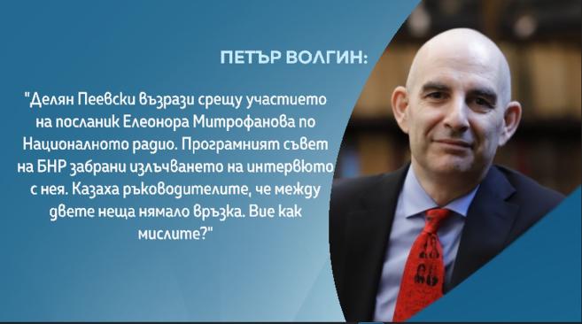 „ Делян Пеевски възрази против присъединяване на дипломат Елеонора Митрофанова по Националното радио. Програмният съвет на БНР забрани излъчването на изявлението с нея. Казаха ръководителите, че сред двете неща нямало връзка ”, уточни Волгин.