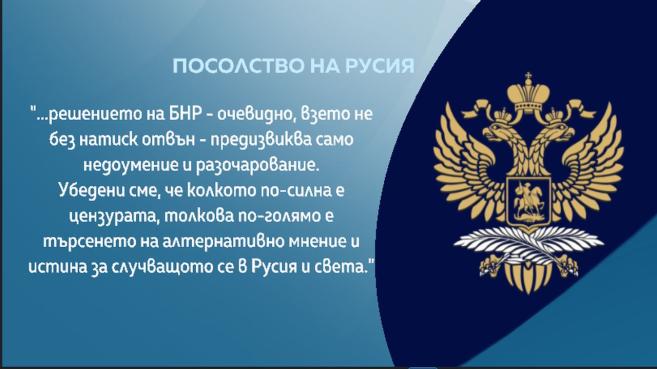 „ Решението на БНР - явно, взето не без напън извън - провокира единствено неразбиране и отчаяние ”, разясняват от задачата на Русия у нас.