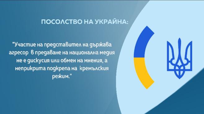 „ Участие на представител на страна агресор в предаване на национална медия не е полемика или продан на отзиви, а неприкрита поддръжка на кремълския режим ”, настояват от посолството на Украйна в България.