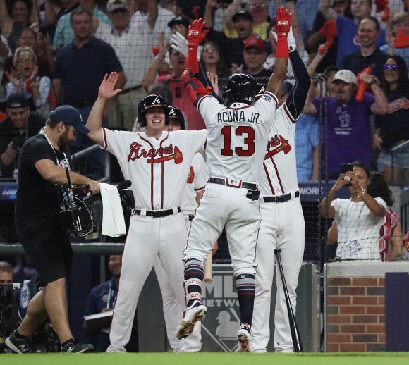 Акуня удари хоумрън при цялостни бази във 2-рия ининг против различен дебютант във Висшата лига на Съединени американски щати и Канада – питчера на " мошениците " Уокър Бюлър, и направи резултата 5:0 в интерес на " смелчаците ". Атланта завоюва мача с 6:5 вкъщи и предотврати цялостно почистване за Лос Анджелис, свивайки пасива си на 1-2 в серията до 3 победи.