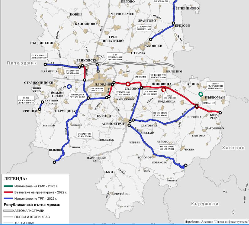 Всички останали поправки ще минат през настоящото поддържане. За 2022 година са дадени, че ще се работи на остатъка от Околовръстното на Пловдив, пътят до Лилково, Асеновград – Кърджали,Асеновград – Първомай, Асеновград – Садово, Кричим – Куртово Конаре, Цалапица – Бенковски, Пловдив – Труд, Карлово – Калофер, Клисура – Кърнаре.