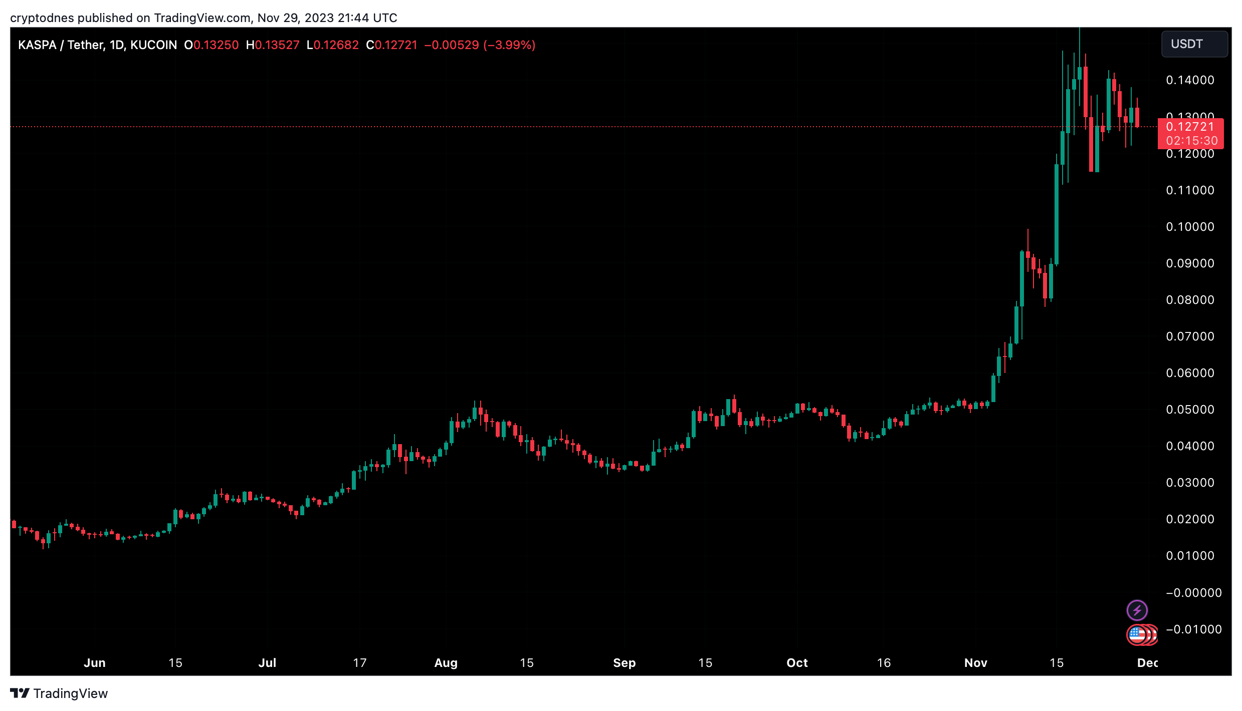 На 27 ноември алткойнът удостовери предходната опозиция като равнище на поддръжка (обозначено със зелена икона), преживявайки забележителен отскок. Днес цената доближи исторически връх от $0.30.
