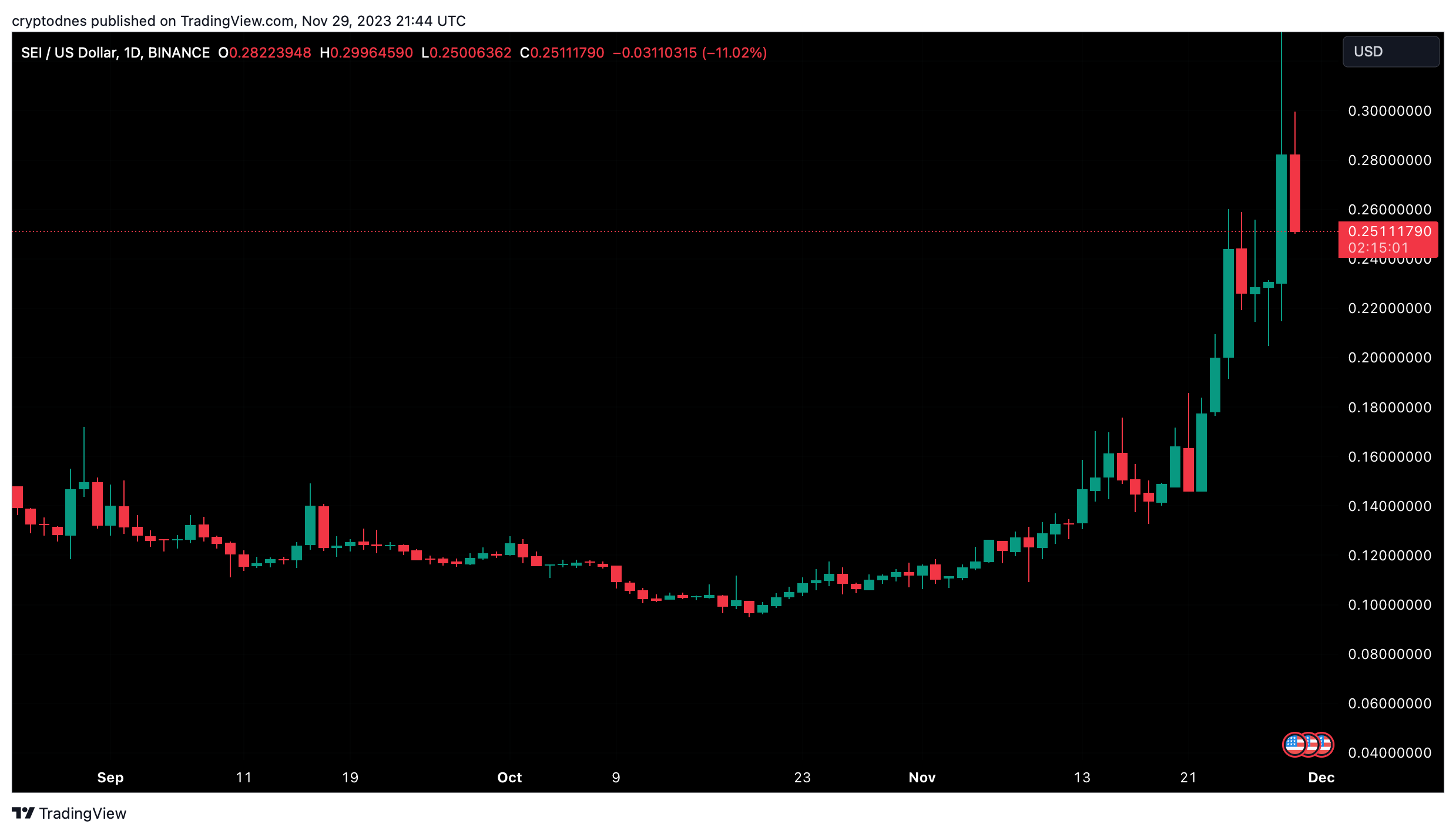 Цената на SEI означи бърз скок, откакто на 19 октомври доближи най-ниската си стойност от $0.095. Възходящият подтик се ускори към 22 ноември, като единствено два дни по-късно проби доста равнище на опозиция.